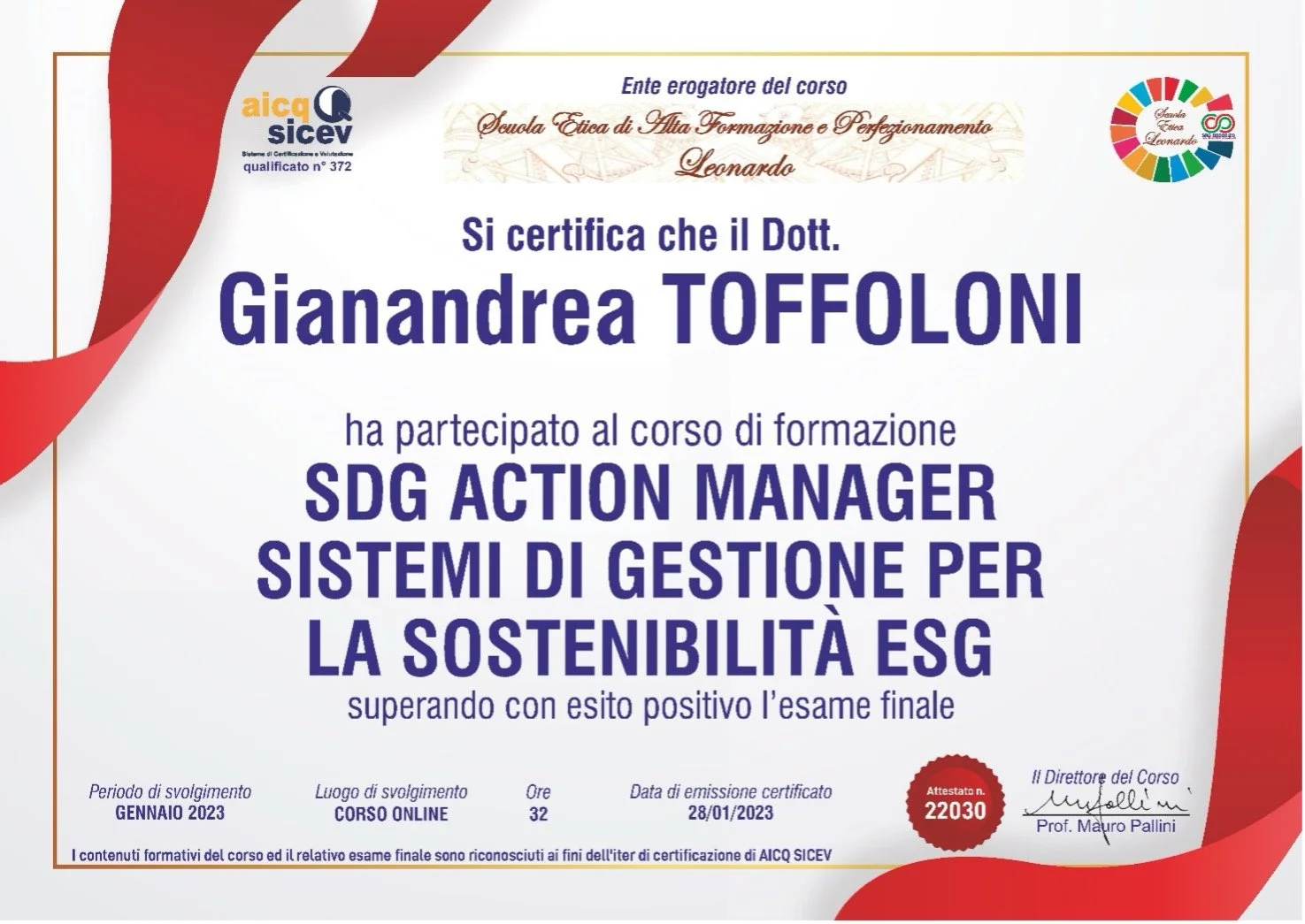 Nel 2022 ha partecipato al corso di formazione SDG ACTION MANAGER – SISTEMI DI GESTIONE PER LA SOSTENIBILITA’ ESG erogato dalla Scuola Etica di alta formazione e perfezionamento Leonardo superando con esito positivo l’esame finale.